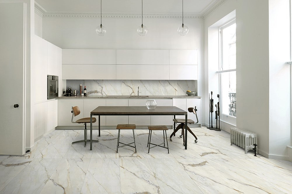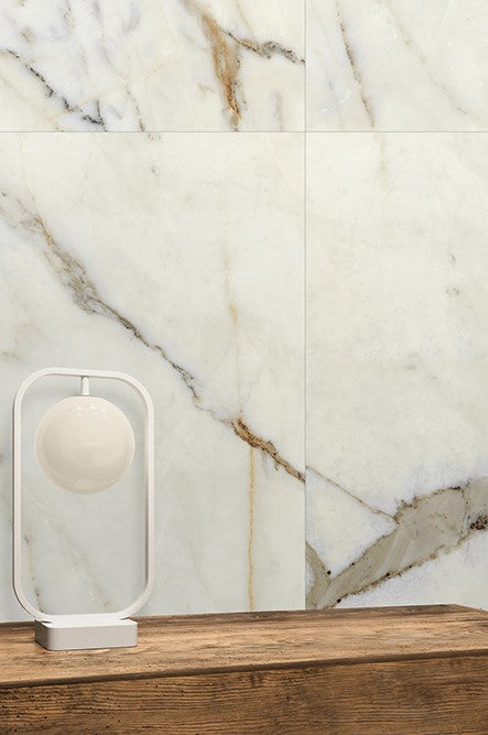 American-made Forty8 Calacatta Oro 24x48 enhances our current collection of white marbles with warm, golden veining. This large format glazed porcelain tile is available in two finishes: Honed and Polished. This gorgeous tile has a warm white background with dark and gold veining, replicating an authentic Italian marble. The tonality and veining coordinates beautifully with the Classic 2.0 series
